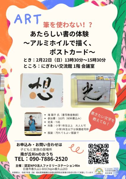 こんにちは。 ファミリーステーションRinです。 2月22日(日)13:30〜 にぎわい交流館で体験活動と交流会「書を楽しもう」 を開催します🖌️ 身近なものを使ってポストカードづくり✨ 書きたい文字のリクエストもOK! 小学生向けの活動ですが、保護者の方の参加も大歓迎です☺️ 詳しくはチラシをご覧ください📄 みなさまとお会いできるのを楽しみにしています🌱 この事業は、独立行政法人福祉医療機構様の助成金を活用して開催します。